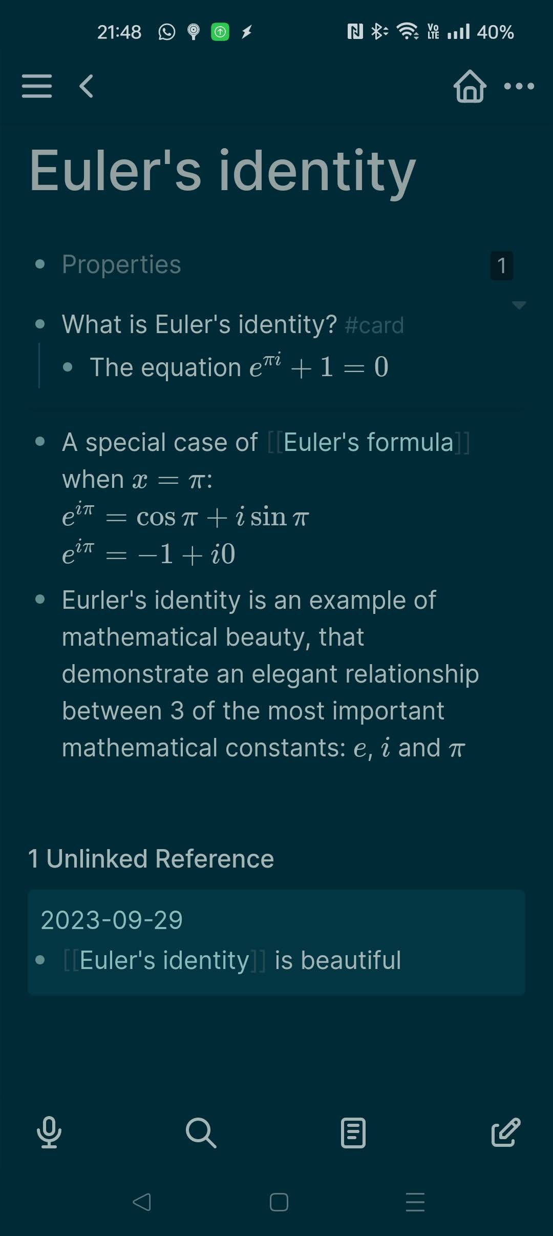 I started to use Logseq in the fall of 2023, and with almost 9 months of use, I’m confident it is a great mobile application for Org-roam. Some applications do a better job at being compatible with the Org file format (e.g. organice) however they do not support Org-roam readily. Logseq, while a bit lax with its support of the Org file format (more on that in a bit), is closer to Org-roam’s Zettelkasten philosophy: links between pages are a breeze to create, backlinks show up immediately and the journal entries quickly becomes your entry point for time management.